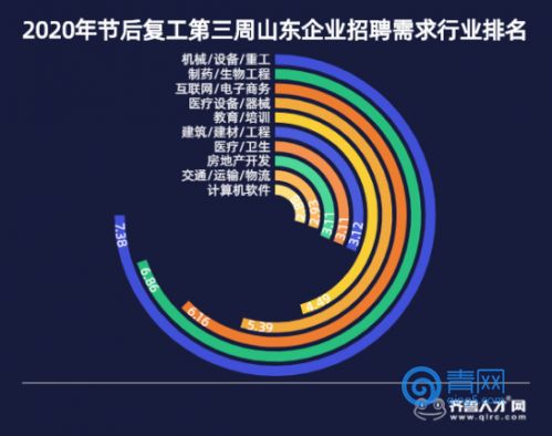 节后复工第三周山东就业市场企业招聘需求行业排名中,机械/设备/重工行业需求最为旺盛,占比达7.38%。作为工业大省,山东在牢牢坚守疫情防控“第一战场”绝不松懈的同时,精准施策,多措并举,为取得复工复产“第二战场”的胜利打下了坚实的基础。截至2月21日,山东28369家规模以上工业企业中已复工24411家,复工率达86%,位居全国前列。