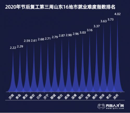 2020年节后复工第三周山东省16地市的求职者就业难度指数平均为3.04,济青就业难度指数较小,分别为2.22和2.29;泰安、潍坊、日照就业难度指数分别为2.59、2.61和2.68;滨州就业难度最大,就业难度指数为4.02。